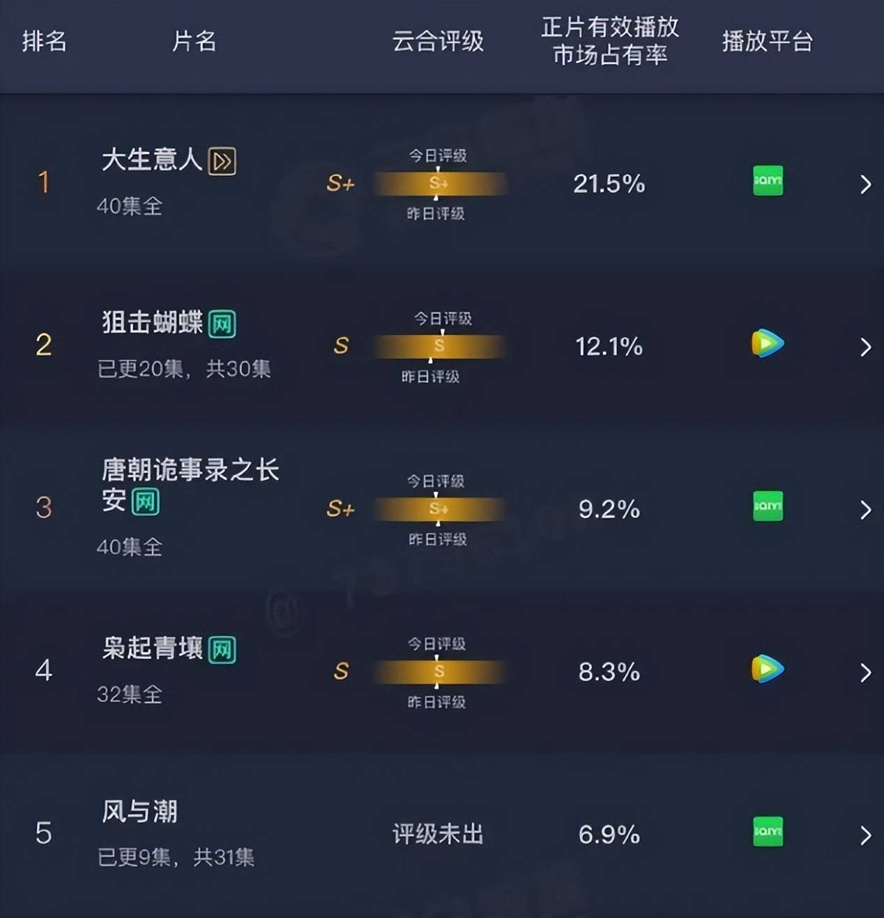 《大生意人》和《狙击蝴蝶》开启对打模式,随着剧情更新,《大生意人》迎来大结局,《狙击蝴蝶》正在热播中,看到这样的情况,很多网友都忍不住问:《狙击蝴蝶》的正片有效播放市场占有率会登顶吗?