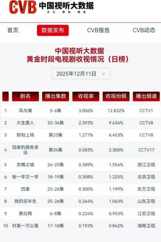 《风与潮》刚开播的时候,聂远在自己的社交账号帮助女儿宣传,所以部分网友才知道《风与潮》开播,随着剧情更新,我们可以看到,这部剧的收视率成功破3%,紧随其后的是陈晓主演的《大生意人》。