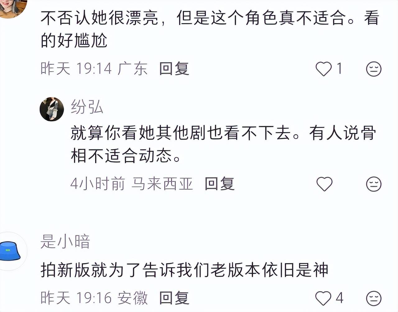 观众本来就对原版有滤镜,而像她这种本身演技不够的女主角,就更不能服众了。