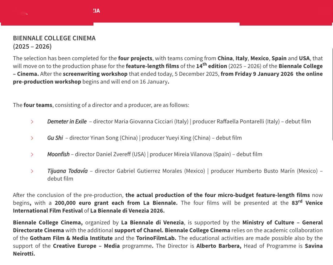 在这一背景下,威尼斯双年展电影学院(Biennale College – Cinema,以下简称BCC)的意义,并不在于其“应然性”,而在于其清晰而自觉的制度选择——作为电影节附属机制,主动将电影节的功能从展示平台延伸至制作环节,直接介入电影的生产过程。