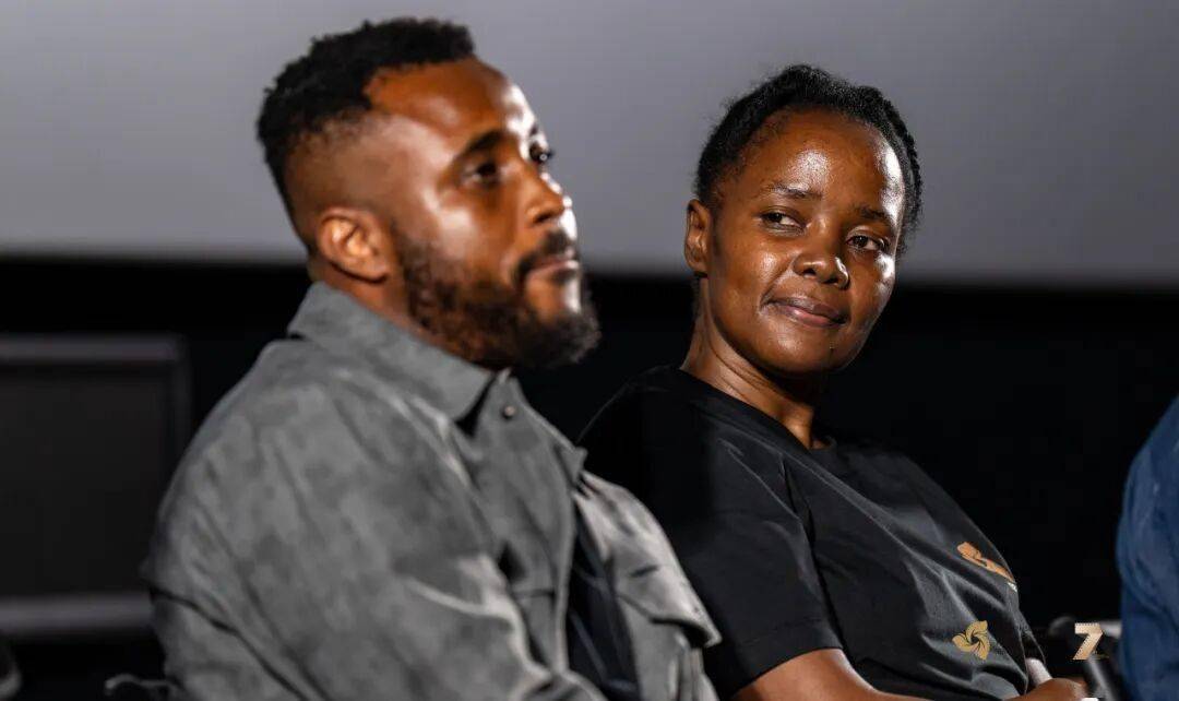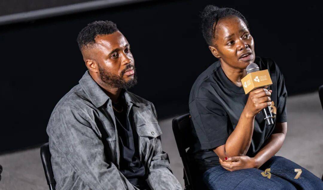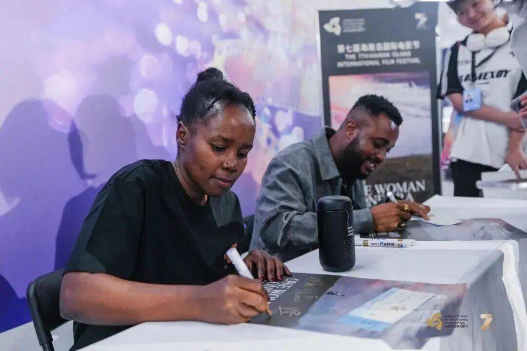 《孤女、胸罩、土地证》的导演温乔·恩乔古与制片约书亚·奥拉乌瓦在海南岛国际电影节映后环节