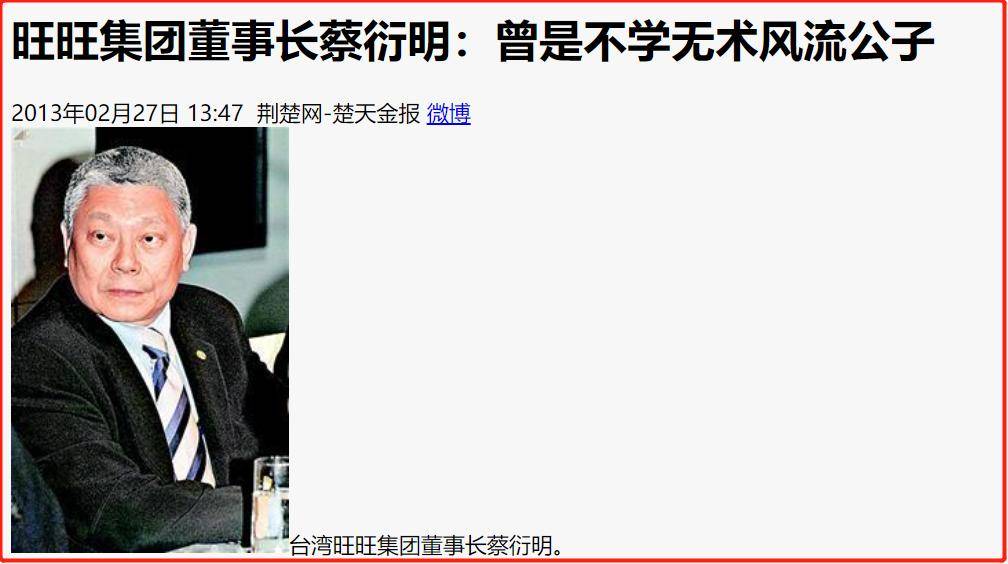一、如果没有那笔昂贵的学费,蔡衍明的生活可能会有很大的不同。蔡衍明出生于1957年,生长在台北一个富裕家庭。从小他就爱逃课,和一群小伙伴一起在街头闲逛。他回忆道:每天早上,一开窗,楼下就有一堆人排队等我逃课,因为我口袋里总是有很多零花钱!那时,蔡衍明是孩子们中间的领头人物,和高年级的学长打架,嘴里总是脏话连篇,喜欢说干XX。尽管他有些公子哥的坏习惯,但他为人非常孝顺,也很仗义。家里虽然雇有佣人,但蔡衍明依然亲自倒父亲的夜壶;朋友有难,他总是第一个伸出援手……1976年,19岁的蔡衍明光荣退学,开始在父亲的食品厂做总经理。
