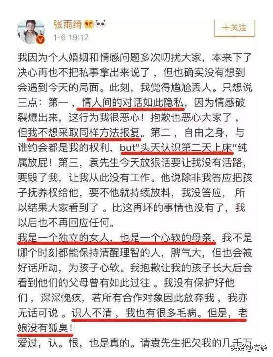 这倒也怨不得看客们心硬如铁,实在是张雨绮斩断情丝的刀锋太过迅疾,其速度与效率,在网友心中已能媲美那昼夜不息、马力全开的工业风扇。回望她的情路,便是一部充满戏剧张力的编年史:2008年与汪小菲的恋情,曾因一场当街的风波戛然而止;随即,她转身便与看似敦厚的导演王全安步入婚姻殿堂,谁知对方却以一场荒唐闹剧亲手为自己戴上了“银手镯”,而当时身处风暴眼的张姐,甚至来不及擦拭泪痕,便已如闪电般再度出击,与袁巴元闪婚并诞下一对龙凤胎。