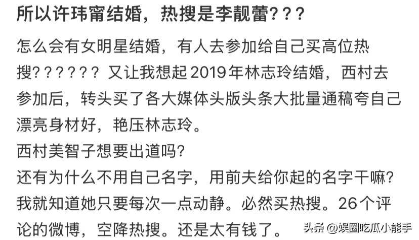 更引人侧目的是,婚礼之后的风向悄然偏转。本该独占头条的新婚喜悦,竟被“李靓蕾参加婚礼”的词条压过一头,登上了热搜榜单。该词条阅读量虽超百万,讨论度却寥寥,这巨大的反差仿佛一面镜子,映照出网络热度下若隐若现的人工操纵痕迹。网友们的诧异与调侃随之而来,原本属于邱泽许玮甯的祝福主场,意外沦为公众讨论营销现象的舞台。这场婚礼,在星光与争议的交织中,留下了令人回味无穷的娱乐圈剪影。