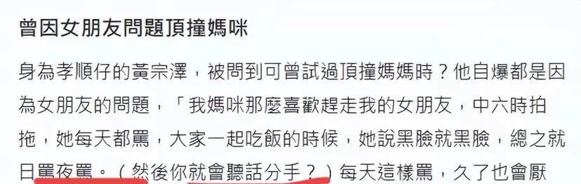 舆论的浪潮瞬间被引爆。社交媒体上,有人怒斥他将不婚的“锅”甩给母亲,也有人唏嘘慨叹,说他被原生家庭的阴影牢牢捆缚。然而,剥开这句看似叛逆的玩笑外壳,内核却是一个苦涩而漫长的故事。时间被拉回他的中学六年级,情窦初开的少年迎来了第一场恋爱。可餐桌却成了没有硝烟的战场,母亲冷若冰霜的面孔、猝不及防摔下的筷子、对准女友的尖锐指责,像一根根细针,扎破了青春的甜蜜气泡。“穿成这样像什么样子!”这样的话语,最终让年少的恋情无疾而终。自此,母亲仿佛成了他爱情路上的“终极考官”,黄宗泽的苦笑背后,是近乎绝望的无奈:“她对所有前任都挑剔到过分。”