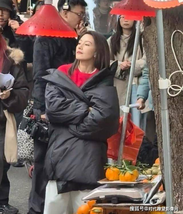 最绝的是她的“冻龄秘籍”——没有浓妆艳抹,只是简单打底,46岁的脸上连法令纹都浅得几乎看不见,下颌线却依旧清晰利落。休息时她披上厚厚的黑色羽绒服,双手环抱取暖,侧脸线条在老街光影里柔和又立体,这状态让网友忍不住对比:“同期女星都在靠医美维持,她怎么像吃了防腐剂?”