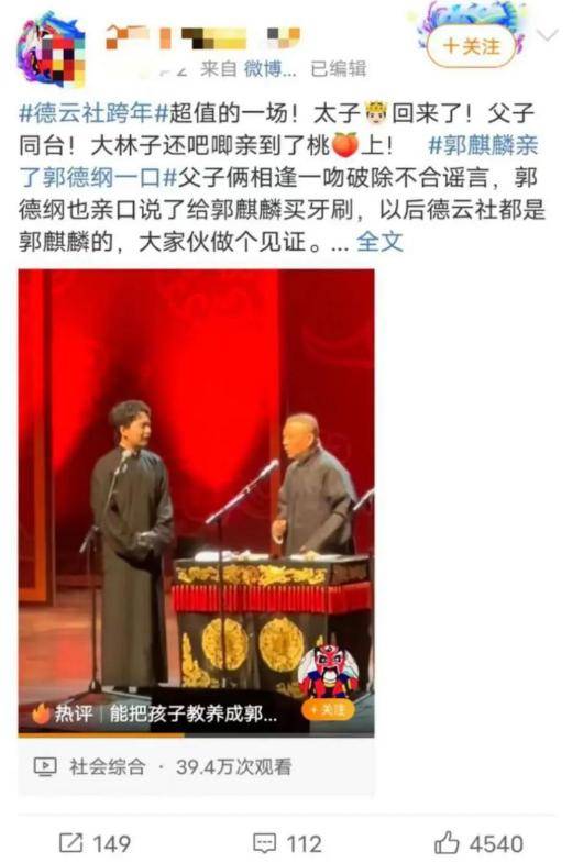 相比于德云社继承人的问题,当时的观众更关注郭麒麟亲了老郭一口,力破父子不和传闻。