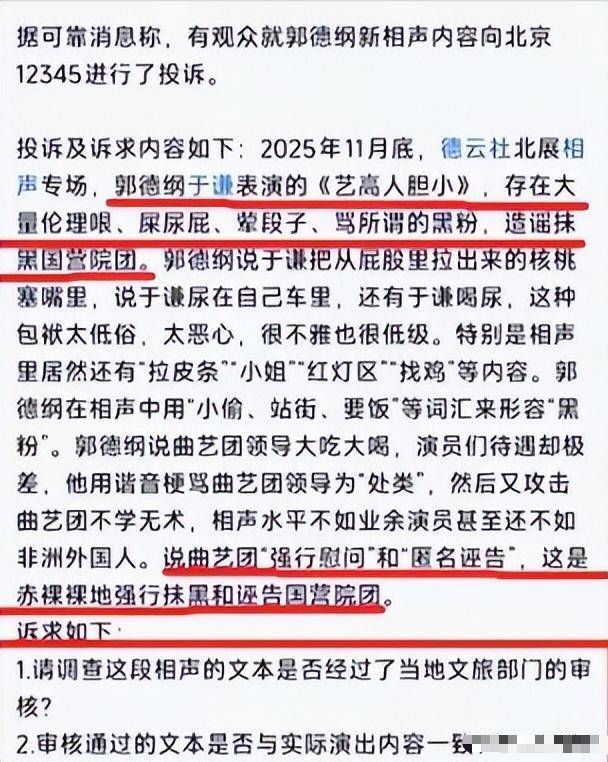 投诉者声称,11月底郭德纲与于谦在专场中表演的《艺高人胆小》存在多重问题。