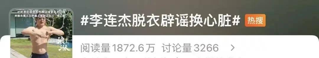 有网友留言称:李连杰脱衣辟谣“换心脏”。这条信息留言迅速登上热搜榜。