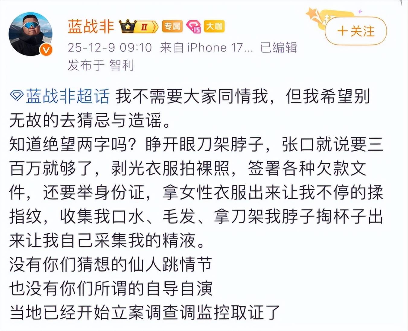 如果说上述事件还属于娱乐圈常见的“情感罗生门”与“行为争议”,那么网红蓝战非的遭遇,则更像一部惊心动魄的跨国犯罪纪实片。他的南非之旅,从踏入机场那一刻起,便踏入了犯罪团伙精心编织半年的陷阱。深夜,利刃加颈,醒来便是噩梦的开端。劫匪的“专业”与“贪婪”令人胆寒——不仅掠夺财物,更通过刷脸网贷、收集生物信息等极端手段进行深度勒索。尤为讽刺的是,绑匪甚至假扮粉丝与他交谈,在恐吓中透露出这场劫案乃是长期策划的“成果”。尽管身体未受严重伤害,但此经历无疑是一次残酷的身心摧残。