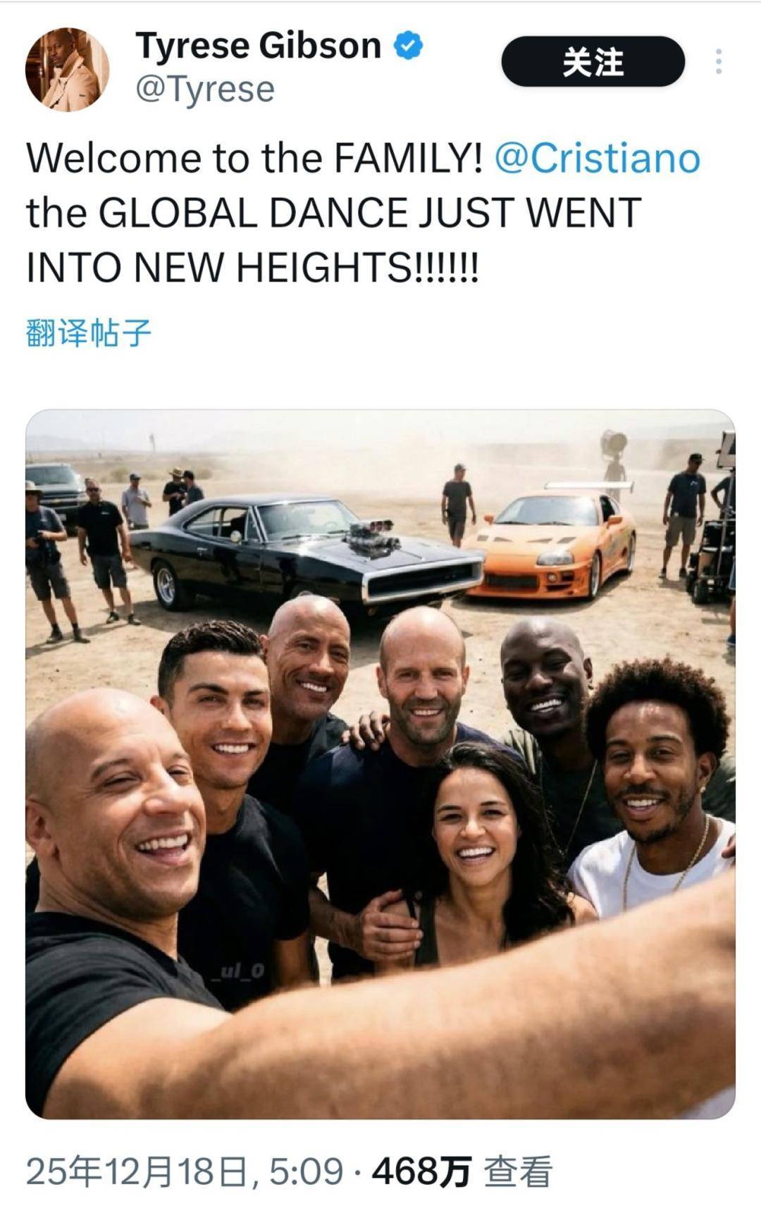 12月18日,系列主演泰瑞斯·吉布森再添重磅实锤,通过社交平台发布剧组工作照,C罗身着干练造型现身片场,正式确认当日为其进组拍摄的第一天。泰瑞斯在配文中热情欢迎:“他绝对是其中一员!我们为他量身打造了特别的东西,”并分享了C罗与主演团的同框合影,进一步坐实这场跨界合作的真实性。