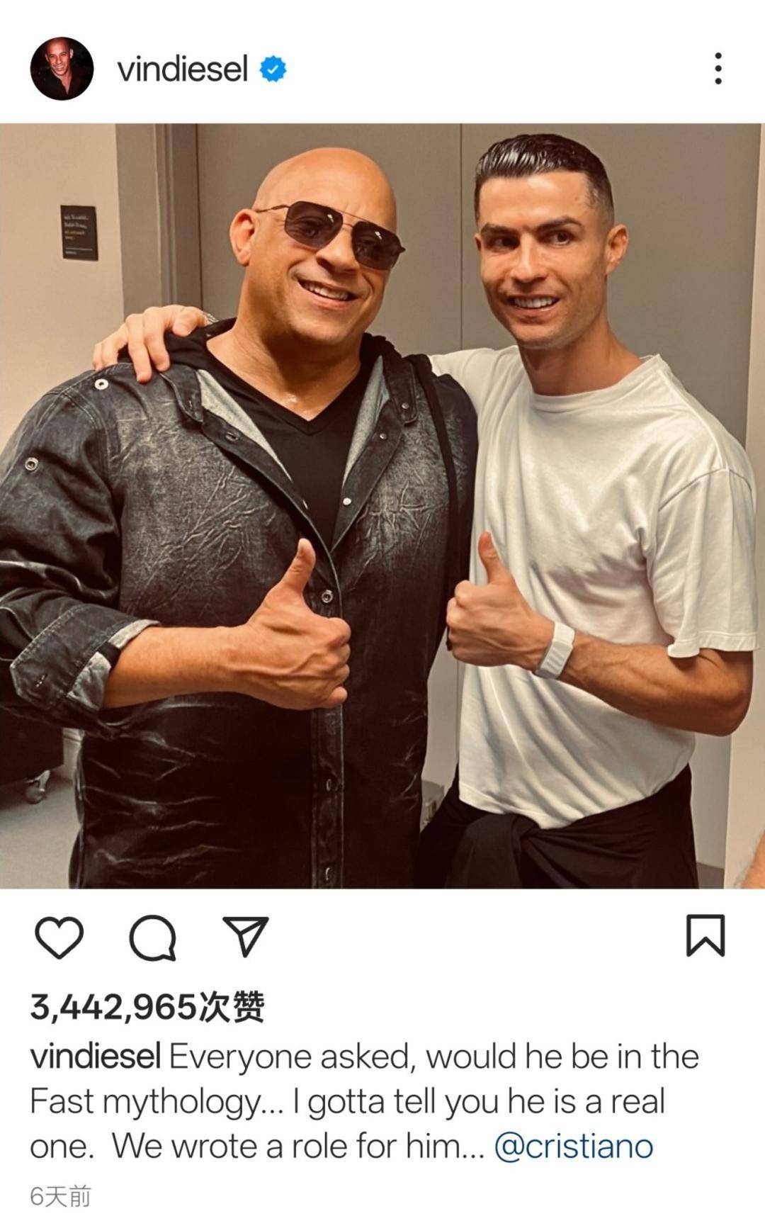 12月13日,范·迪塞尔曾在社交媒体平台晒出与C罗的并肩合影,两人面带微笑竖起大拇指,配文直接回应全球粉丝疑问:“所有人都在问他是否会加入速激宇宙......我得告诉大家,他是真正的狠角色,我们专门为他写了一个角色,”并特意艾特C罗本人。这条动态如同引爆流量的导火索,两小时内狂揽百万点赞,“C罗加入速激宇宙”话题迅速冲上多国热搜榜首,被不少《速激》系列影迷和球迷称为“顶流的双向奔赴”。