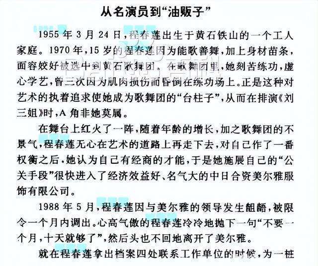 人们排着队要她签名,她的歌曲磁带也在市场上供不应求。 此后,程春莲继续出演经典剧目《马兰花》。凭借扎实的基本功和《刘三姐》的影响力,许多人慕名前来捧场。 没多久,程春莲实现了儿时的梦想,成为了大明星。经过多年的努力,她在歌舞团的地位也稳固了下来。只要不出意外,她的未来将一片光明。 然而,程春莲并不满足于此。她开始有了更大的野心。 **下海经商** 虽然程春莲的生活已经发生了翻天覆地的变化,但她依旧不满足于拿着剧团的固定工资。再加上《刘三姐》的热度逐渐减退,如果没有新作品,很快就会被替代。 正好,在改革开放的背景下,许多人纷纷下海经商,靠商业获得了暴利。程春莲觉得,既然别人都能成功,那么自己也有机会。 因为缺乏经验,她起初非常谨慎。她决定先在公司做个员工,了解一下市场行情。很快,她就进入了中日合资的美尔雅服饰有限公司,开始做店铺销售。 凭借出色的外貌和口才,程春莲刚到公司就成为了销售冠军,还迅速与上层领导建立了联系。但不久后,程春莲被公司举报,要求她一个月后离开。 程春莲非常自信,她冷冷地丢下一句话:十天就够了。说完便离开了公司。 尝到成功的甜头后,程春莲开始认为自己有经商的天赋。一次偶然的机会,她进入了当地的一家石油公司,并与梁某建立了联系。 梁某看中了她的美貌,而程春莲则看中了梁某的高位。进入石油公司后,程春莲很快被提拔。 **走上违法之路** 程春莲越来越胆大,她与梁某合作,决定进入倒卖石油的行业。尽管这条路违法且充满风险,但他们被利益蒙蔽了双眼,执意走下去。 程春莲没想到,这个决定最终把她推向了无法回头的深渊。 她一开始还小心谨慎,倒卖少量石油。然而,随着多次成功,她变得越来越大胆。短短一年时间,她已经倒卖了价值几十万元的石油。 然而,天网恢恢,一封举报信让她的犯罪行为曝光。举报信详细描述了她和梁某的违法行径,引起了警方的高度关注。 1989年,程春莲被逮捕。她拒不认罪,一直辩解说自己是在为国家经济做贡献。 面对铁证如山的证据,她最终被判死刑。在得知判决结果后,程春莲仍不悔改,拒绝接受任何减刑条件。直到走上刑场,她才意识到自己无法逃脱,开始痛哭求饶。 然而,一切已经太迟。当一声枪响响起,程春莲的生命也随之终结。 **结语** 如果程春莲能继续坚持自己的初心,朝着梦想努力,或许她的结局会有所不同。然而,生活没有如果,做过的事情也无法重来。 克制欲望,抵制诱惑,是每个人一生中都需要学习的重要课题。