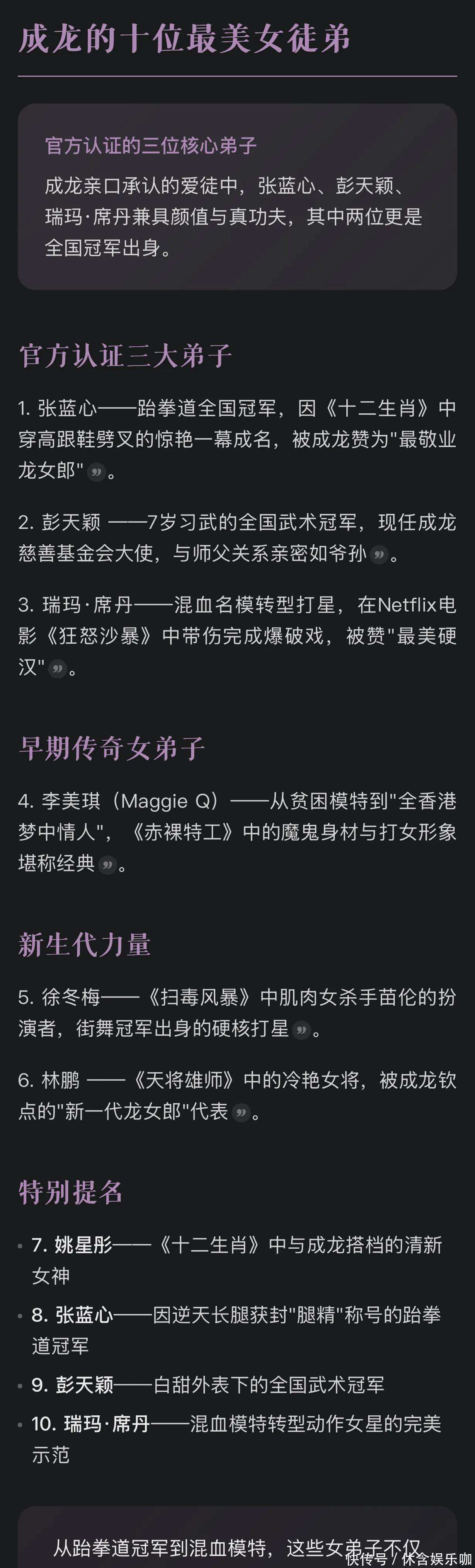10. **瑞玛·席丹**——作为混血模特转型为动作女星,她的演艺生涯堪称完美示范,展现了如何从时尚圈跨足动作电影领域。 这些女弟子们从跆拳道冠军到混血模特,她们不仅重新定义了龙女郎的标准,更展现了东方女性独特的力量美学。张蓝心在打戏中的惊艳表现、彭天颖扎实的武术功底、瑞玛的成功转型,都是她们个人实力的最佳体现。