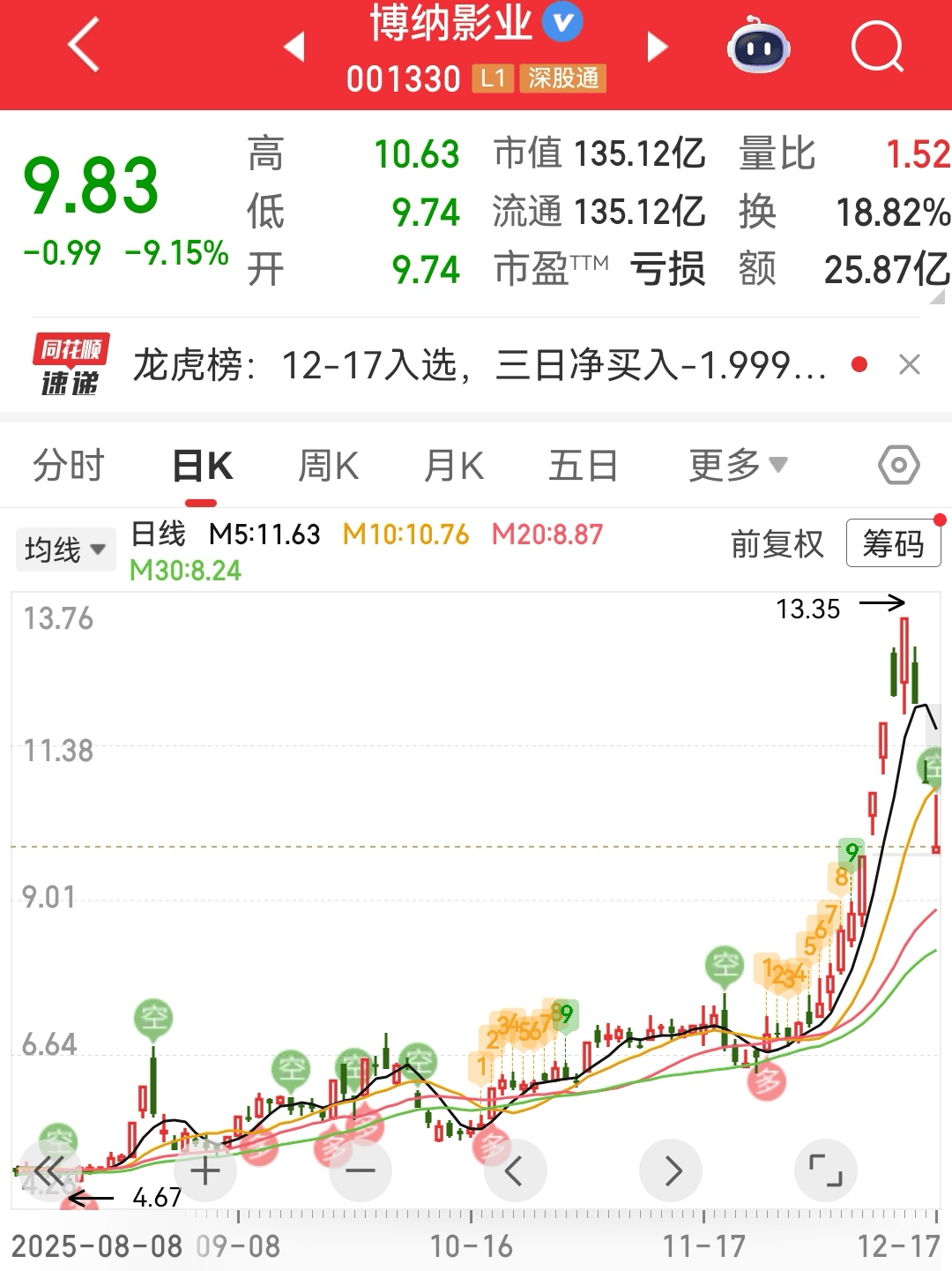 《阿凡达3》上映前,博纳影业股价经历了一波大幅上涨,从11月21日低点时的6.5元涨到了12月12日高点时的13.35元,不到一个月股价翻倍。