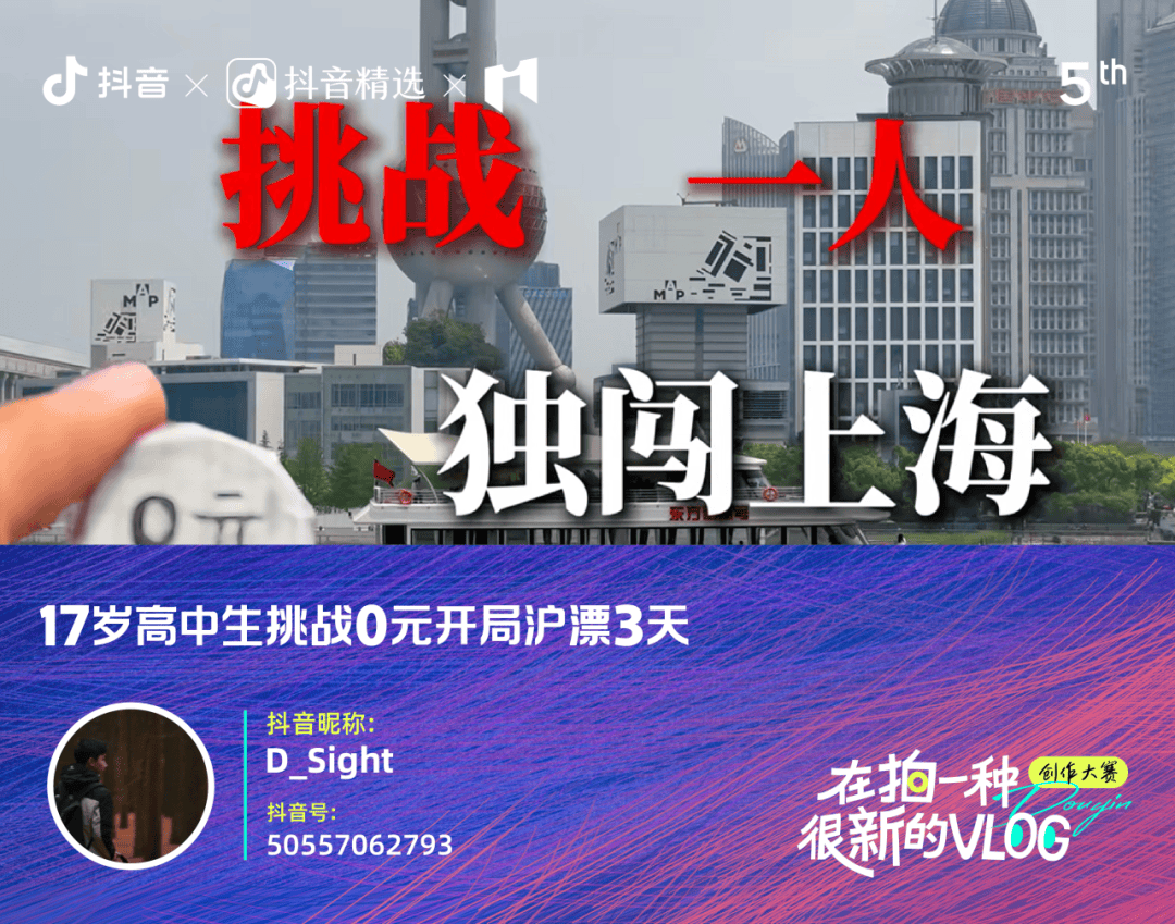 我在去年刷到博主零元生存视频,有颗种子便落进心里。今年五一,17岁的我正困在执行力、目标感飘忽的迷雾中。于是决定把零元沪漂3天挑战,变成给迷茫内心世界开的药方。镜头里,我追着“被拒绝100次”的目标往前闯,狼狈时的手足无措、咬牙坚持的笨拙蜕变,都是最诚实的注脚。我本意是想练沟通、磨抗压,却意外看清了自己骨子里的韧性。然而挑战从未结束,作为省重点中学的学生,学业与创作的双线并行,比零元生存更磨人。成绩平平的我,常在题目与剪辑间两头碰壁,我知道现在不够好,但“想就去做”是沪漂教我的道理。哪怕慢一点,也要在能力里做到极致。我会慢慢走向更顽强的自己,走向未来该有的光亮。我,无限进步。