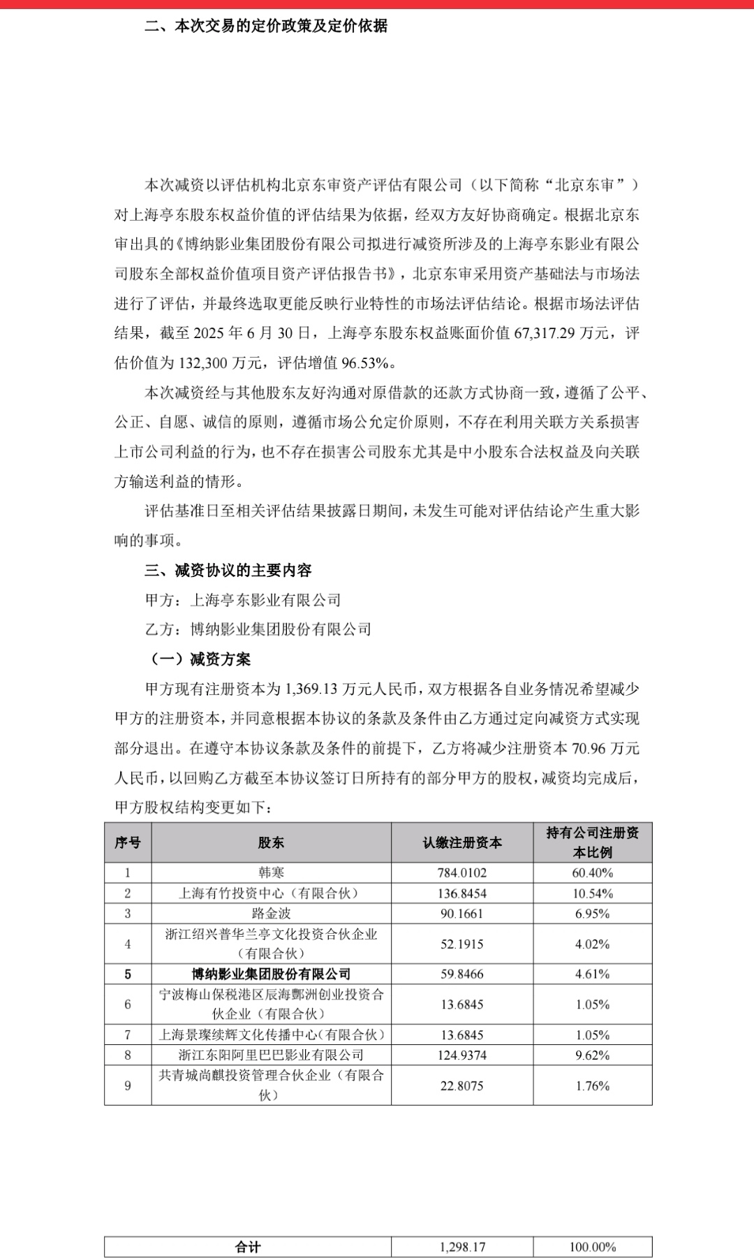 本次博纳影业的减资以评估机构北京东审资产评估有限公司对上海亭东股东权益价值的评估结果为依据,北京东审采用更能反映行业特性的市场法评估结论,截至2025年6月30日,上海亭东股东权益账面价值6.73亿元,评估价值为13.23亿元,评估增值96.53%。