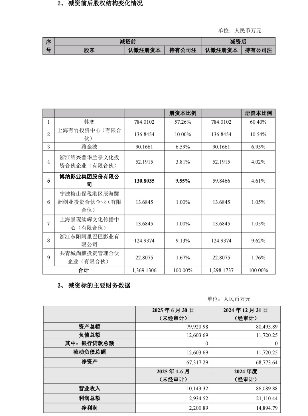 博纳影业减资后,第一大股东韩寒持有亭东影业60.40%股份。第二大股东上海有竹投资中心(有限合伙)持有亭东影业10.54%股份,韩寒是上海有竹投资中心的控股股东,持有其大部分股份。