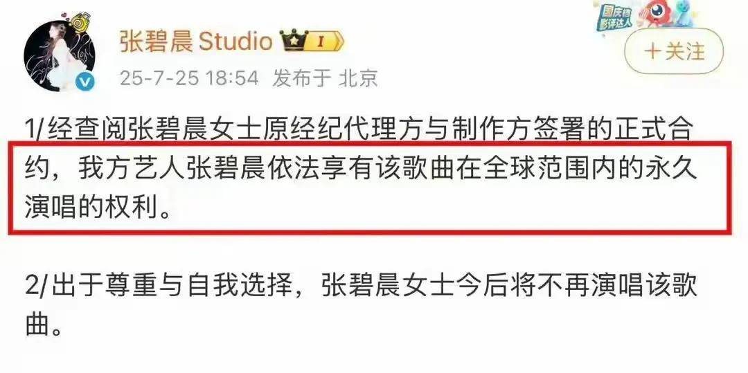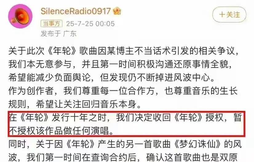 汪苏泷方的回应堪称“釜底抽薪”——直接收回版权,导致张碧晨版本的《年轮》从各大平台下架。曾经在《花千骨》中感动无数人的女声版本,如今再也无法由张碧晨演唱。