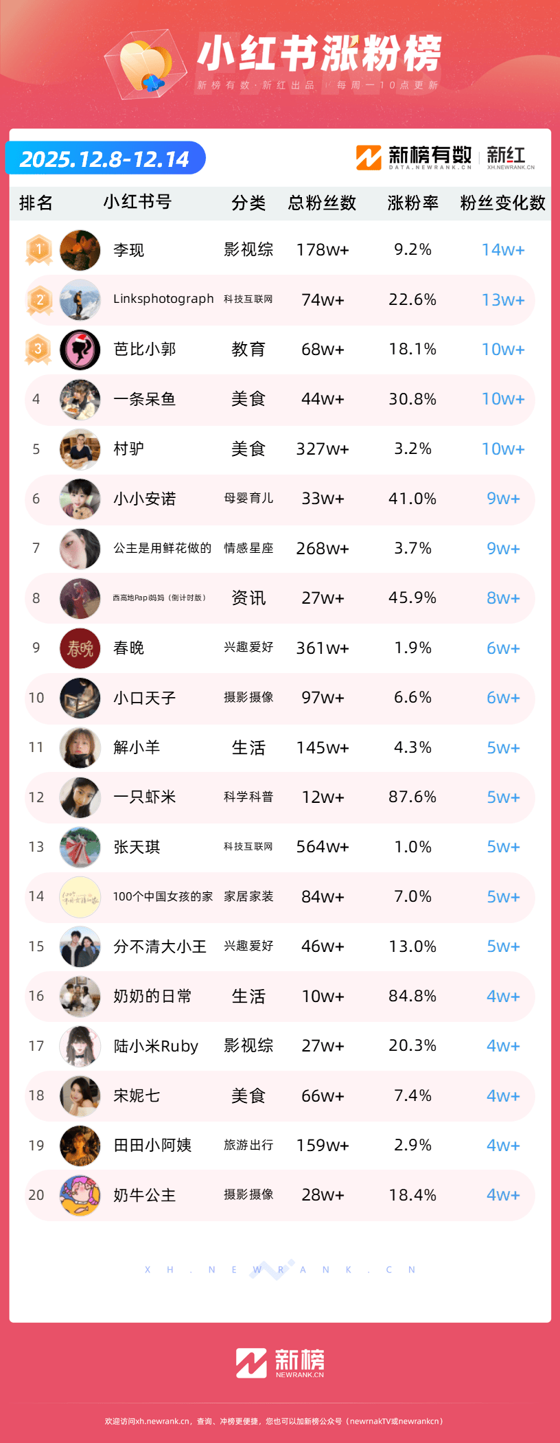 依托新榜旗下小红书数据工具“新红”,新榜推出「小红书涨粉榜」,本次统计周期为2025年12月8日到2025年12月14日。