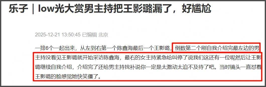 这次星光大赏红毯主持人是综艺演员,这就导致主持并不是很专业,王影璐还没开始自我介绍,男主持就抢话了,王影璐差点被漏掉,旁边女主持连忙救场,场面很尴尬。
