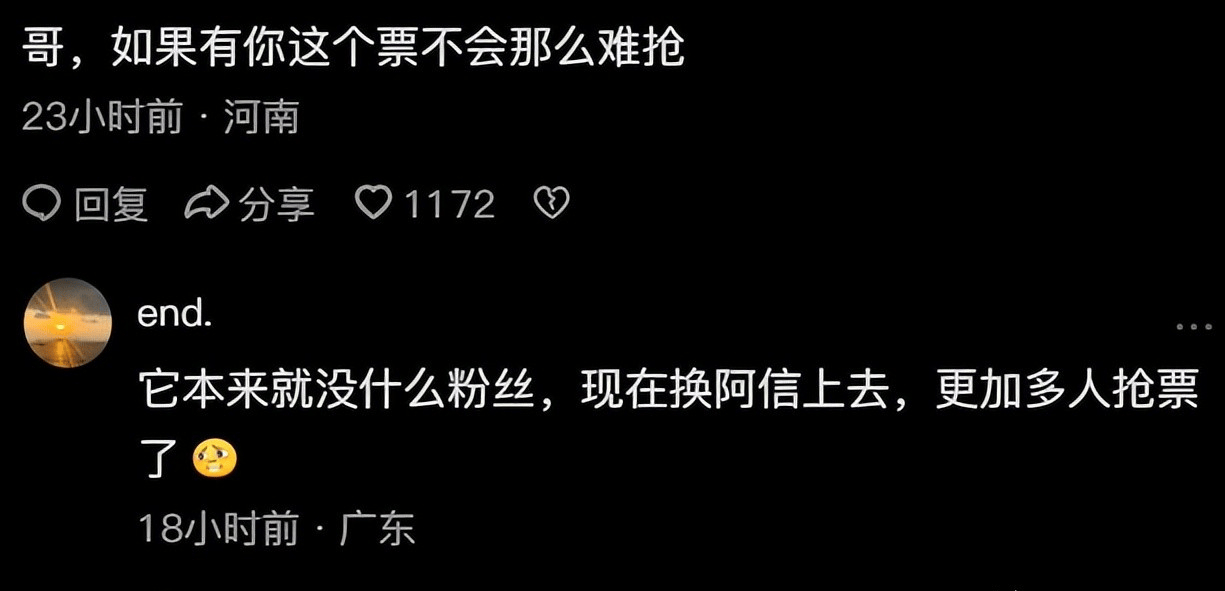 有粉丝晒出阿信的舞台照留言感谢他“退场成全”,他立马给了句酸味十足的回复。