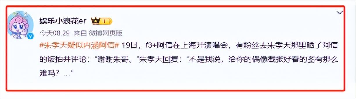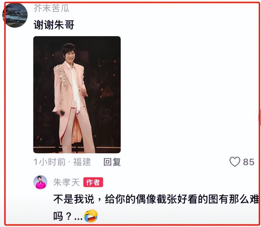 但与此同时,远在屏幕前的朱孝天,却在用自己的方式“参演”着整场演出——他开着小号潜入直播间,还在自己的评论区下,悄咪咪回复了一条关于阿信的留言:“不是我说,给你偶像截张好看的图有那么难吗?”