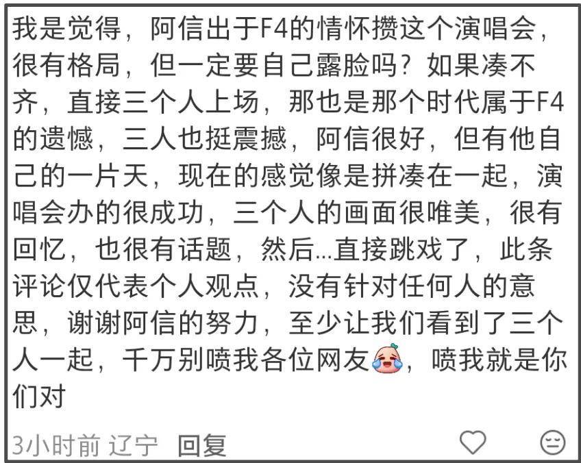 如果你一心想看F4全员,且只有F4组合才有情怀,那F3的演唱会就不适合你。买票之前,最好先想清楚,自己是否能接受阿信和F3一起亮相,毕竟整场演唱会的名字是“F?FOREVER恒星之城”,而不是F4合体。