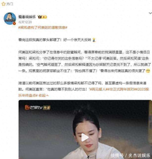 最近,梁淞和何美延的新闻又在社交平台上引发了热议。话题一度冲上热搜,大家纷纷讨论梁淞虚构了何美延的道歉消息,这个反转太过突然,瞬间让人感到不可思议。原本大家以为是他们在节目中分享一些甜蜜时刻,结果一看,却是梁淞突然爆料:这条道歉信息其实是我编的。何美延瞬间脸色大变,整个场面都变得十分尴尬,网友们纷纷指责梁淞不懂珍惜和体贴别人,言辞愈发激烈。
