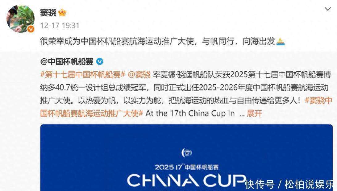 12月17日,窦骁在个人社交账号发布了一条动态,配文写道:与帆同行,向海出行。这一动态不仅透露出他所在船队赢得了中国帐船赛冠军的消息,还引发了网络上的广泛关注和讨论。