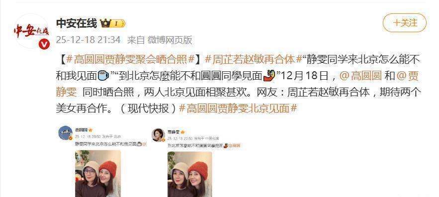 12月18日晚上,演员高圆圆和贾静雯在微博上的一次同步操作,迅速引起了无数网友的关注,仿佛把大家瞬间拉回了22年前的《倚天屠龙记》江湖。两人同时发布了亲密无间的合照,头贴头、笑容甜美,配文分别写道到北京怎么能不和圆圆同学见面和静雯同学来北京怎么能不和我见面。这看似闺蜜之间的日常互动,让话题#赵敏周芷若又同框了#迅速登上了热搜,引发了大量网友的回忆杀。 照片中的两位女神,戴着棒球帽,穿着休闲服,笑容温暖自然,整个人看起来轻松愉快,仿佛时间在她们身上停滞。网友们一方面惊叹她们即使接近五十岁依然美丽动人,另一方面则纷纷开始回忆起她们曾经出演的经典角色,感叹梦回03版《倚天屠龙记》,并笑称张无忌的世纪难题又回来了。甚至有些网友开玩笑地说道:现在看,她们俩在一起反而更合适,这一言论也道出了她们戏外友情的反转魅力。