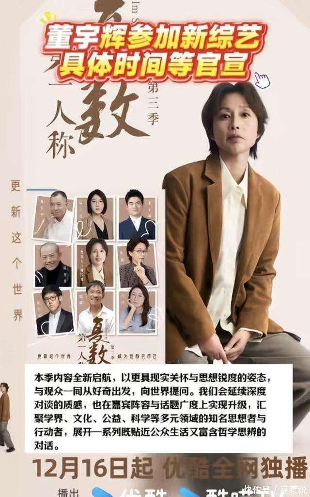 双重暖心惊喜来了!宇辉在新综艺中意外与老朋友同框,42个月的陪伴满是赤诚与真诚。一直期待宇辉有新动态,终于迎来了综艺官宣的好消息,心情无比激动!原来是曾经合作过的周轶君老师特意邀请他,加入优酷节目《第一人称复数》,节目将于12月16日正式开播。虽然目前还不清楚宇辉具体会在第几期亮相,但光是想到他会出现,就让人期待得难以入眠。更让人惊喜的是,节目中还有老朋友陈行甲同框出演,两人都是温柔、有深度、真诚不浮躁的人,相信这场对话一定充满干货又让人治愈,我已经提前搬好小板凳准备守在开播前。