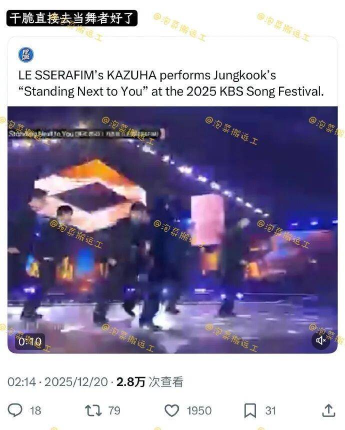 在这场于12月19日举行的年度盛事中,Kazuha选择翻唱防弹少年团成员田柾国(Jungkook)的热门单曲《Standing Next To You》,无疑是一次大胆的挑战。舞台上的她不仅精准复刻了原版舞蹈的强劲力道与复杂细节,更同时完成了歌曲的演唱部分,其整体的舞台掌控力与视觉表现可谓十分抢眼。
