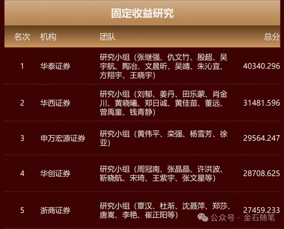 就固收奖项来说,第一名华泰的张继强实至名归;第二名华西的刘郁也很知名,第三名是黄卫平,第四名周冠男,第五名覃汉。