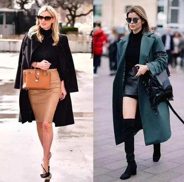秋冬季节,大衣少不了,小皮裙和大衣的搭配,既保暖又显身材,通勤逛街都适合。但在选择皮裙时还要根据外套的颜色来挑,过亮的皮裙会有喧宾夺主的视觉效果,因此在选择时一般以深色系为主。