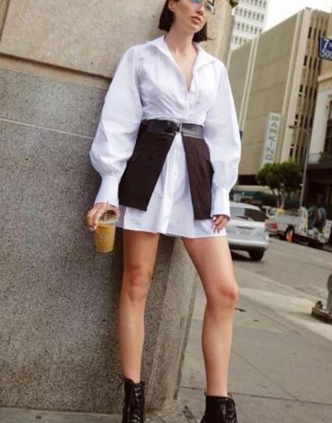 长衬衫自带裙子属性,选择一件纯白长衬衫加上配饰,再蹬上一双高跟鞋,一身衬衫裙的look就完成了。这个搭配看似简单,实际上要穿出好气质却很难, 更推荐运用配饰强调腰线的穿法 ,让你秒变九头身。