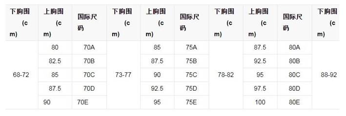 下胸围(cm)68-72,上胸围(cm)80,国际尺码 70A,上胸围(cm)82.5,国际尺70B,上胸围(cm)85,国际尺70C,上胸围(cm)87.5,国际尺70D,上胸围(cm)90,国际尺70E。水平围绕胸部最高点(乳头)一周的长度,即为您的胸上围尺寸,如测量尺寸时遇到小数,测量时建议采用进一法,例如 72.1公分,计算为73公分得到胸上下围的尺寸后,开始计算罩杯的大小:胸上围减去胸下围得出上下围差通过以下围差罩杯对照表,即可以得到最适合的罩杯尺寸。