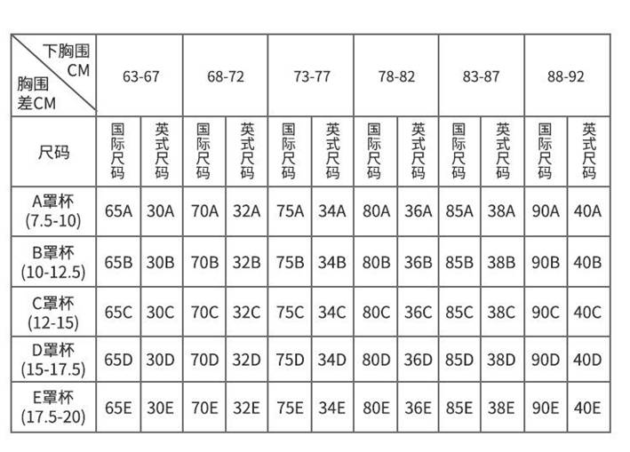 上胸围的尺寸减去下胸围的尺寸,如果差是10cm,那就是A罩杯,如果差是12.5cm,那就是B罩杯,每增加一个罩杯,上下胸围差就要增加2.5cm。