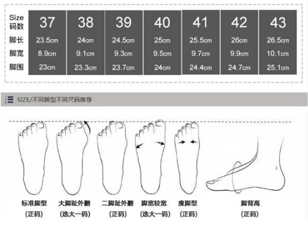 而中国鞋号是以人的脚长为基础,脚长多少毫米,就穿多少号的鞋,例如,脚长240mm,就穿24号的鞋。10mm为一个号,5mm为半个号。每个鞋号又以五个肥瘦型,一型较瘦,五型较肥,肥脚穿肥鞋,瘦脚穿瘦鞋,基本上可以做到按脚型制鞋。