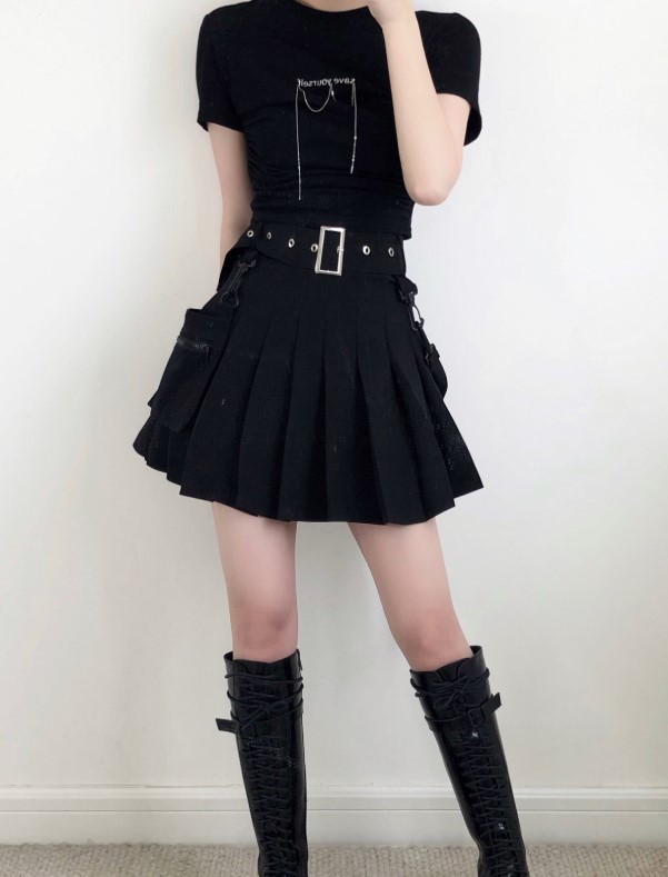 百褶裙真是不用多说了,满满的学院风特别减龄,搭配黑色T恤,虽然整体是深色系列,但毫不影响搭配的少女气息~