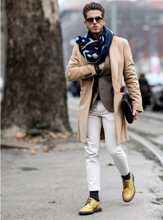 对于爱时尚的男生来讲,这个时候,用一些奇怪的颜色,反而有好处的,例如,用大花的或者是杂色的围巾,才能出效果。
