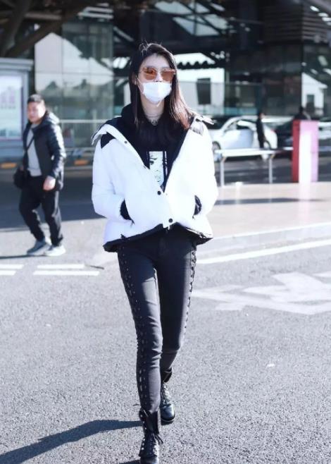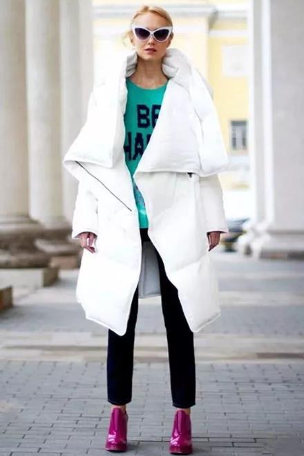4. 搭配四:长款羽绒服运动风。白色长款羽绒服搭配紧身牛仔裤,加上运动小白鞋,显得活泼、青春,还带有一点小俏皮。