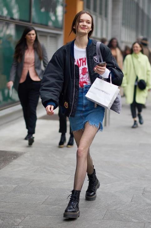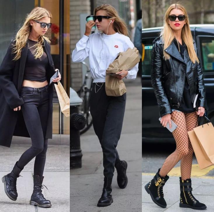 3. 马丁靴与紧身的铅笔裤搭配,会把腿部显得更加细长。如果是霸气紧身的黑色皮裤与马丁靴搭配,更是干净利落,酷到飞起,如果是秀气贴身的牛仔铅笔裤,也可以完全凸显出女生的大长腿。
