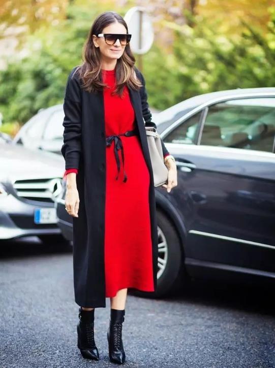 红黑搭配是最为经典的色彩搭配之一,艳丽的红色毛衣外搭一件黑色外套,使整身Look沉稳了许多,并且还能穿出酷酷的感觉。