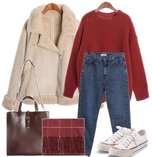 柔和的白色外套搭上红色毛衣,如同红丝绒蛋糕一般,给人带来温暖、甜美的感觉。