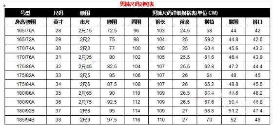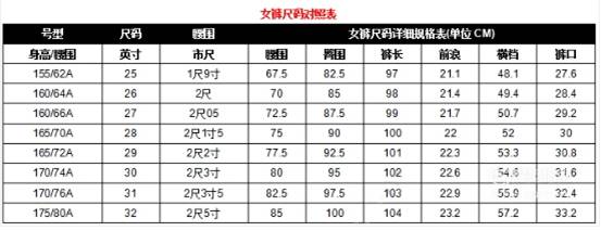另外,还有另一种尺码表,也就是常见的S、M、L、XL,将两者进行对照,可以大概的确定17080a体型的需要穿着M码,也就是中码,建议在买的时候还是依据腰围来,若是大腿或者小腿较粗,可以买稍大一码,这样在穿的时候系个皮带就可以了。