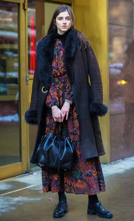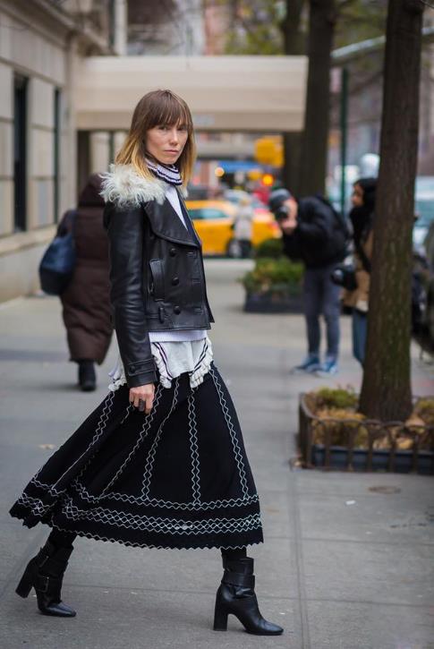 4. 连衣裙和袜裤的搭配冬天是最温暖的,简单的搭个飞行员夹克或者外套,美美的绣花裙也要秀一下。