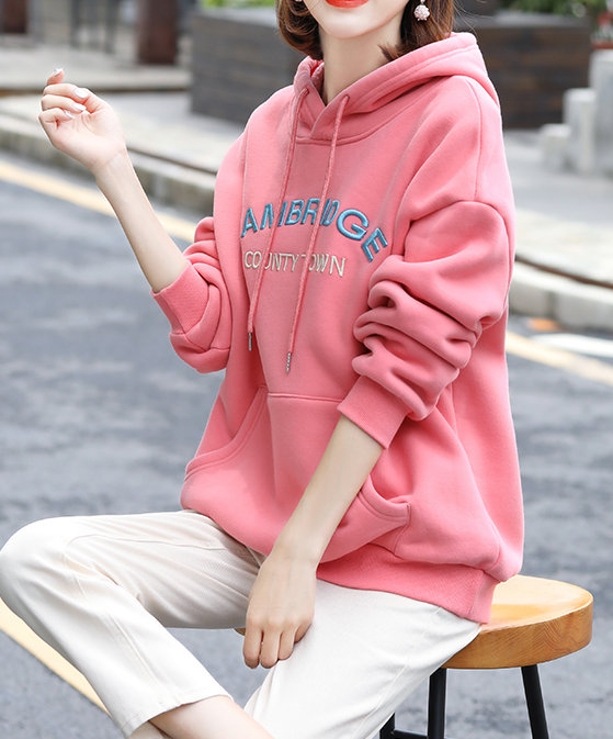 2.粉色卫衣搭配浅蓝色牛仔裤或者黑色牛仔裤