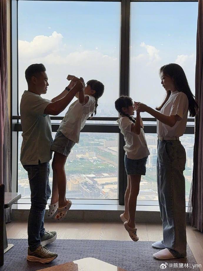 最抢眼的还是一张全家福。一家四口穿着同款亲子装,整齐又温馨。熊黛林长发披肩,简单的白T恤配牛仔裤,侧身站着,身材曲线玲珑,完全看不出是两位孩子的妈妈,平时在保持状态上肯定没少花心思。她双手提起大女儿,妈妈力十足。女儿紧紧牵着妈妈的手,梳着麻花辫,笑得特别开心。小短裤露出她的一双长腿,个子已经很高了。
