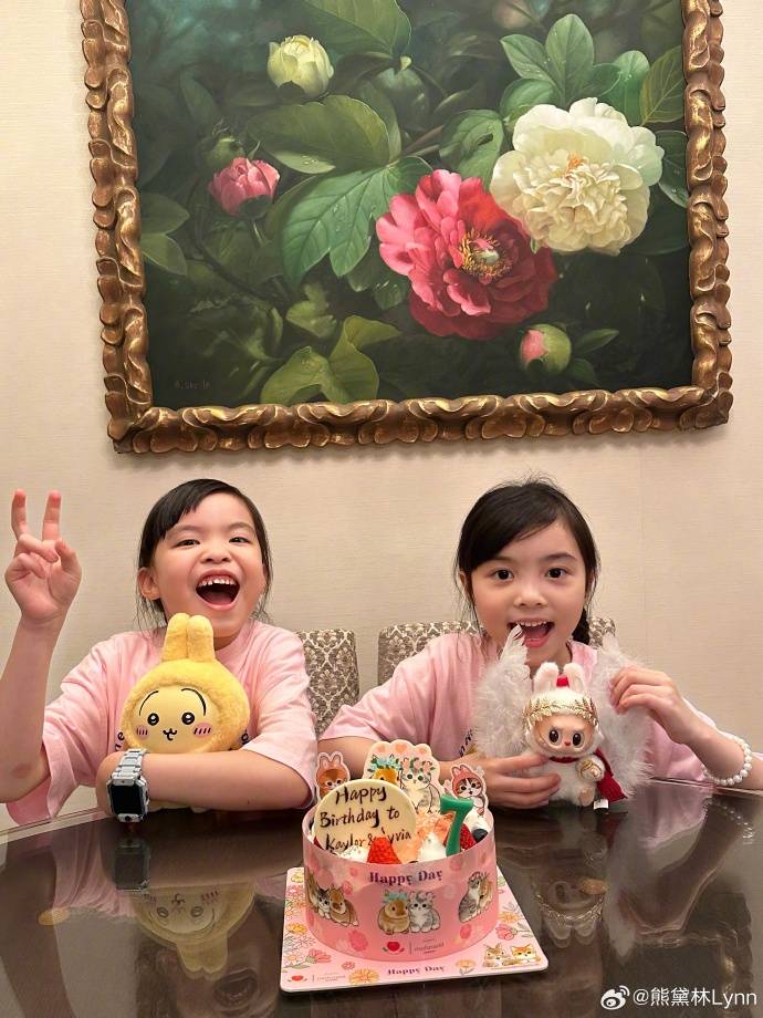 他们家双胞胎女儿挺有意思,一个像爸,一个像妈,长得不太一样。小时候妹妹的颜值还曾被一些网友讨论,如今渐渐长开,五官越来越立体,配上遗传自妈妈的高个子,妥妥的未来小美女。生日那天,郭可颂的姐姐、妹妹和妈妈都来为熊黛林庆生,一家人其乐融融,足见她在婆家很受宠爱。